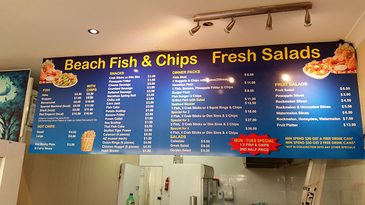 Seen here is a brand new board, installed at Beach Fish and Chips in Rockingham. Our team of designers made the background nice and bright, while our installers were able to tackle this challenging roof-mounted installation.