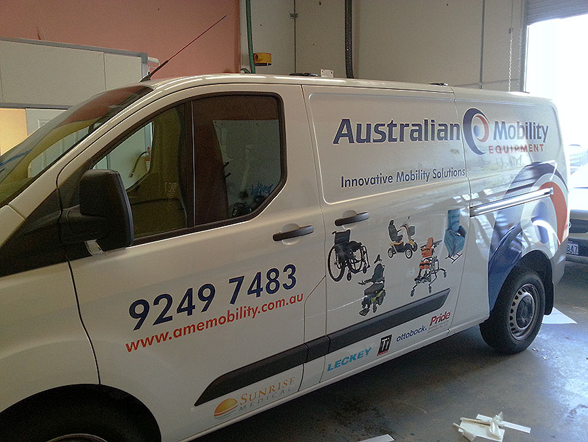 Ford’s new Transit Custom is perfect for signwriting, with large blank sides, which is why when Australian Mobility Equipment approached us to do their van signage, we were able to come up with a powerful design.